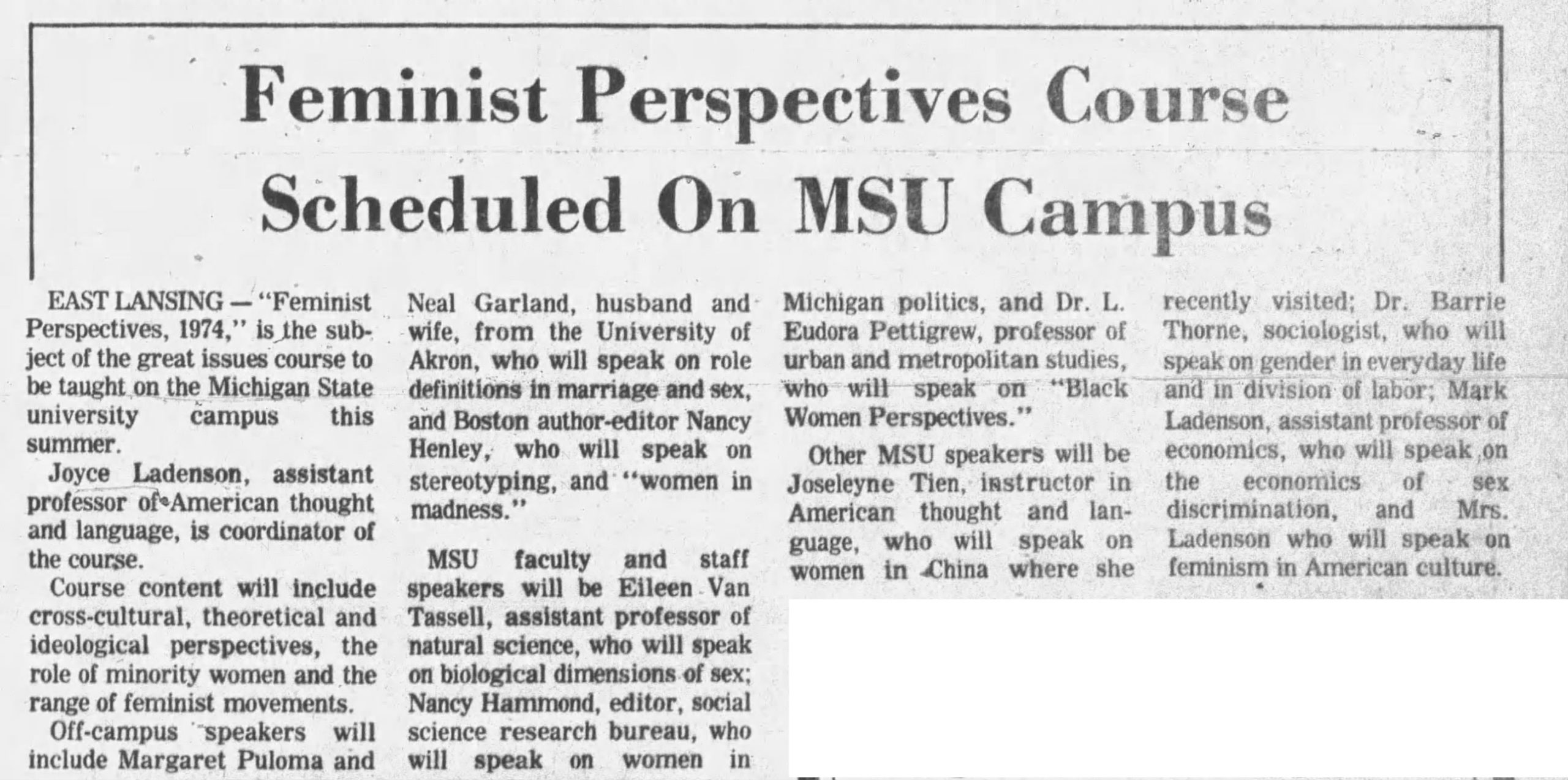 - Feminist Perspectives Course Scheduled on MSU Campus, May 1974.