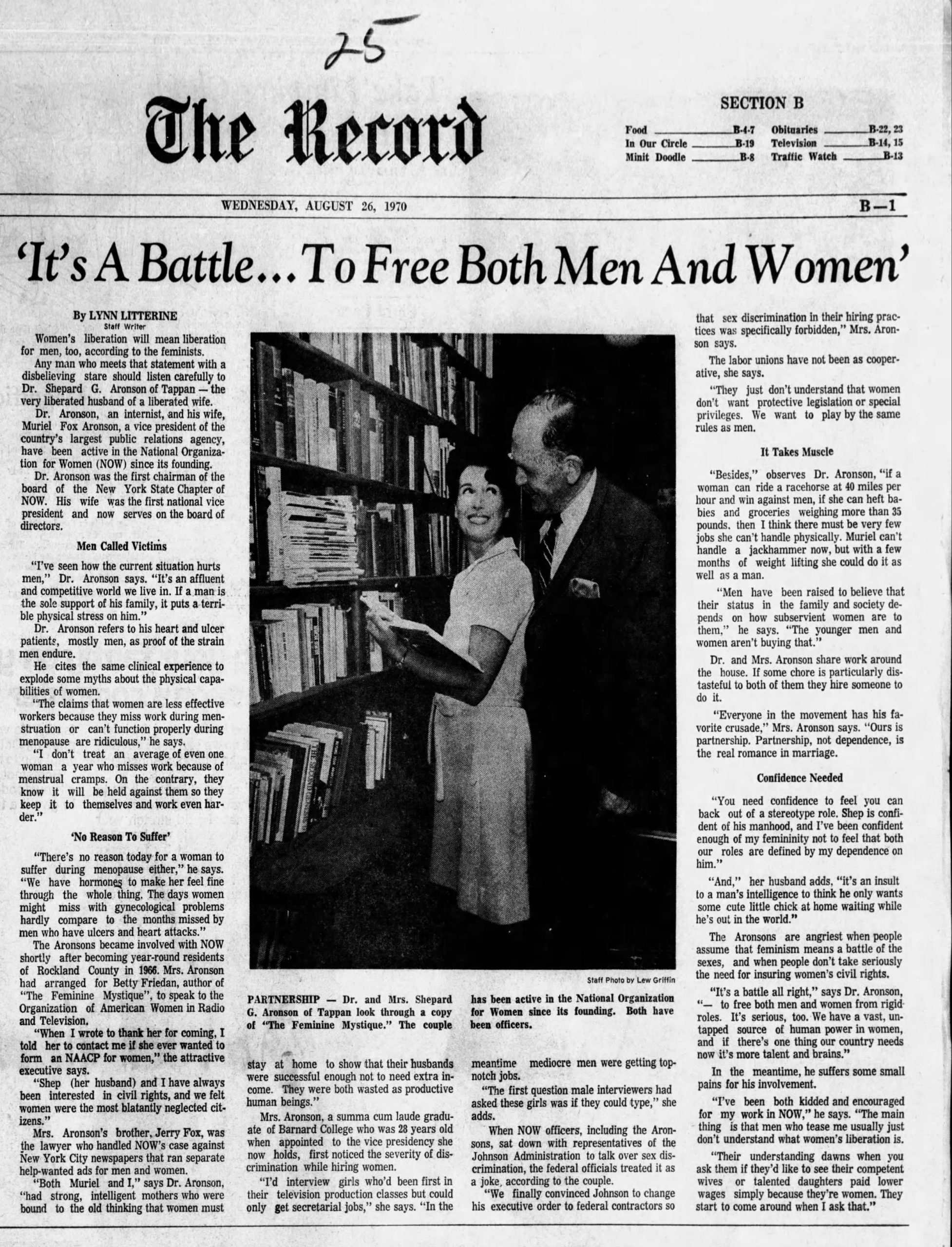 “I have been both kidded and encouraged for my work in NOW. The main thing is that men who tease me usually just don’t understand what women’s liberation is. Their understanding dawns when you ask them if they’d like to see their competent wives or talented daughters paid lower wages simply because they’re women. They start to come around when I ask that.”