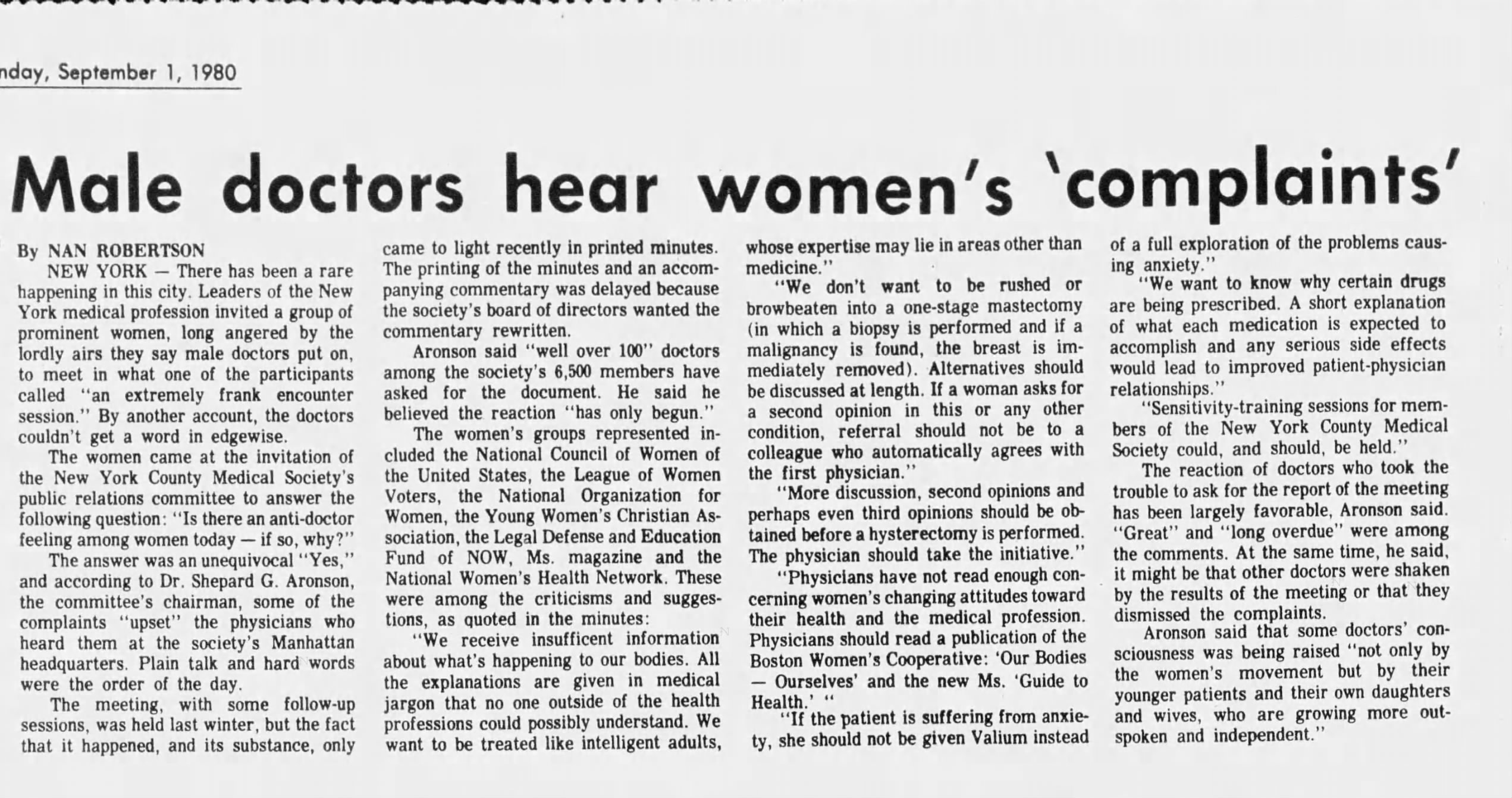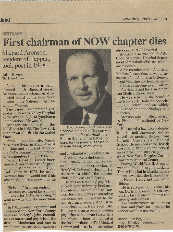 A leader in medical and feminist circles who brought the two worlds together for historic results. Charter member of National Organization for Women (NOW) and attended the founding conference in Washington, D.C., 1966, with his wife Muriel Fox. The first Chair of the Board of the New York chapter of NOW, the first local chapter in the country, 1968. Served on the Medical Advisory Committee of Planned Parenthood of New York. President of the Society of Internal Medicine of the County of New York. Organized a meeting in the New York Medical Society to improve doctors’ attitudes toward nurses and a meeting to improve doctors’ attitudes toward female patients. He persuaded Pan Am Airlines to revise its policy requiring flight attendants to weigh less than a certain weight. He had a contract from Pan Am to do entrance physicals. He told the airline their weight restrictions were mistaken, and refused to follow that requirement.