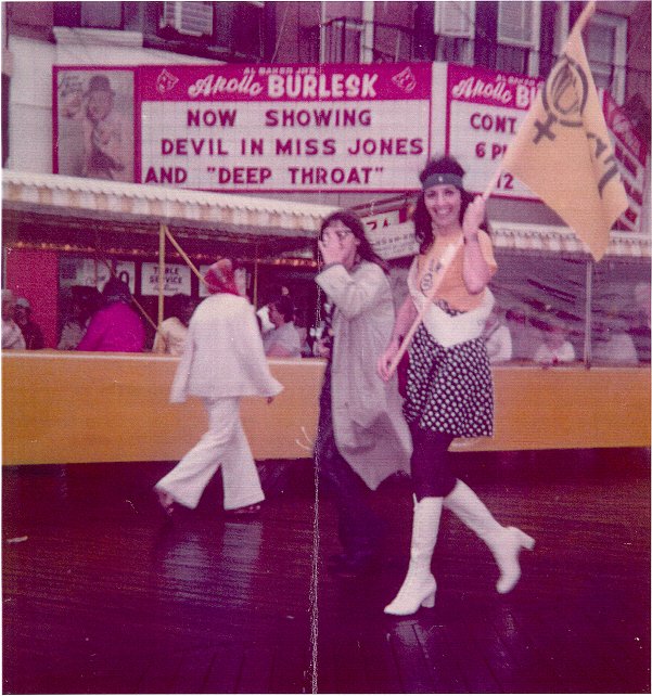 At the time, I was Assistant State Coordinator of Connecticut NOW, having just recently re-located to Stamford from Raleigh, North Carolina in 1972. In Raleigh, I was the first president of the NOW chapter on the North Carolina State campus that was formed in 1971.The NOW State Board selected me to represent Connecticut along with the other eastern region NOW Wonder Women. it was an exhilerating experience. My 75 year old mother came from Philadelphia to watch us parade on the board- walk and we received some fairly good national publicity. My husband, Ken, who has always been a staunch supporter of both me and the feminist cause, took the picture. He thought it ironic that the marquee behind me was showing a porno film.